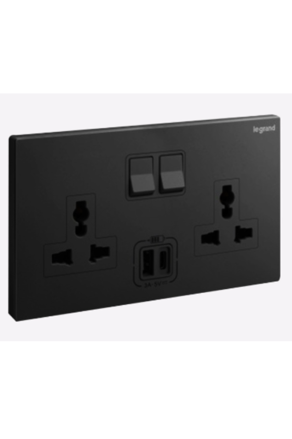 Galion – 2 gangs Multistandard switched socket outlet with 3A type-A and type-C USB chargers –