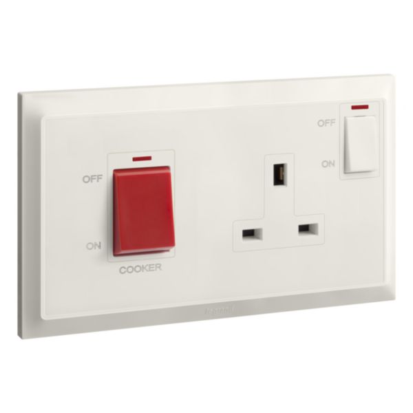 Legrand Belanko S – 2 gang double pole switch – 45A + BS switched socket outlet neon with cooker marking – 13A –