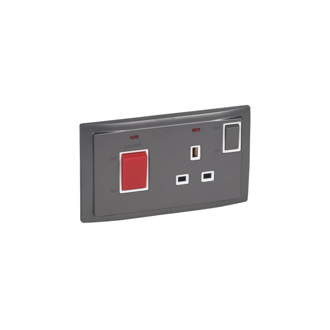 The 45A DP switch with 13A BS and neon is an electrical component that is designed for use in the UK. The component consists of a 45-amp double-pole switch and a 13-amp British Standard (BS) socket, both of which are mounted on a single faceplate. The switch is rated for up to 45 amps of current and has two poles, which means it can switch off both the live and neutral connections to the socket simultaneously.