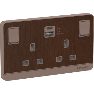 Schneider AvatarOn switched socket with USB charger 21W type A C 2 gang 13A wood E83T25ACUSB_WD_G12