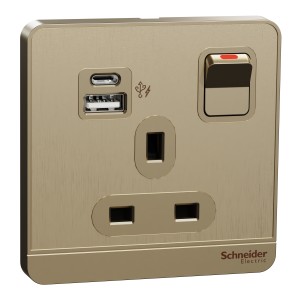 Schneider Switched socket with USB charger, Avataron, 21W type A C, 13A, Metal gold hairline E8315DACUSB_GH