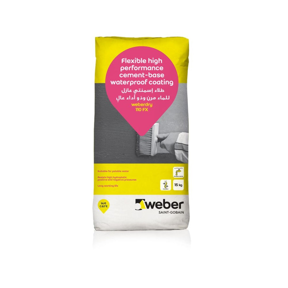 Product details: Flexible high-performance cement-based waterproof coating weberdry 110 FX is a two component polymer modified cementitious coating: Powder made of cements, fillers and admixtures. Liquid based on resins and additives. It is available in Grey and White . weberdry 110 FX cures to form an elastomeric, waterproof, flexible and resistant membrane, suitable for use in potable water tanks, reservoirs, canals and tunnels. Surface of application Floor, Wall
